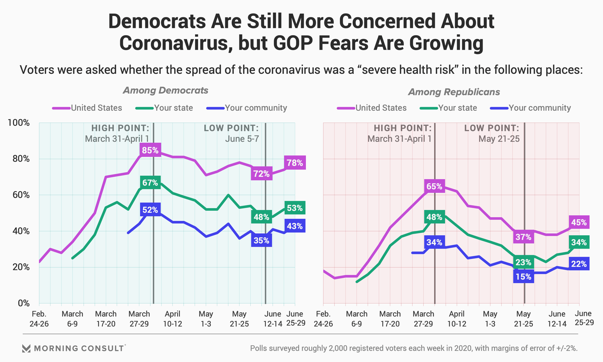 34% of GOP voters say COVID-19 is a “severe health risk” in their own state, up 8 points since the end of May.