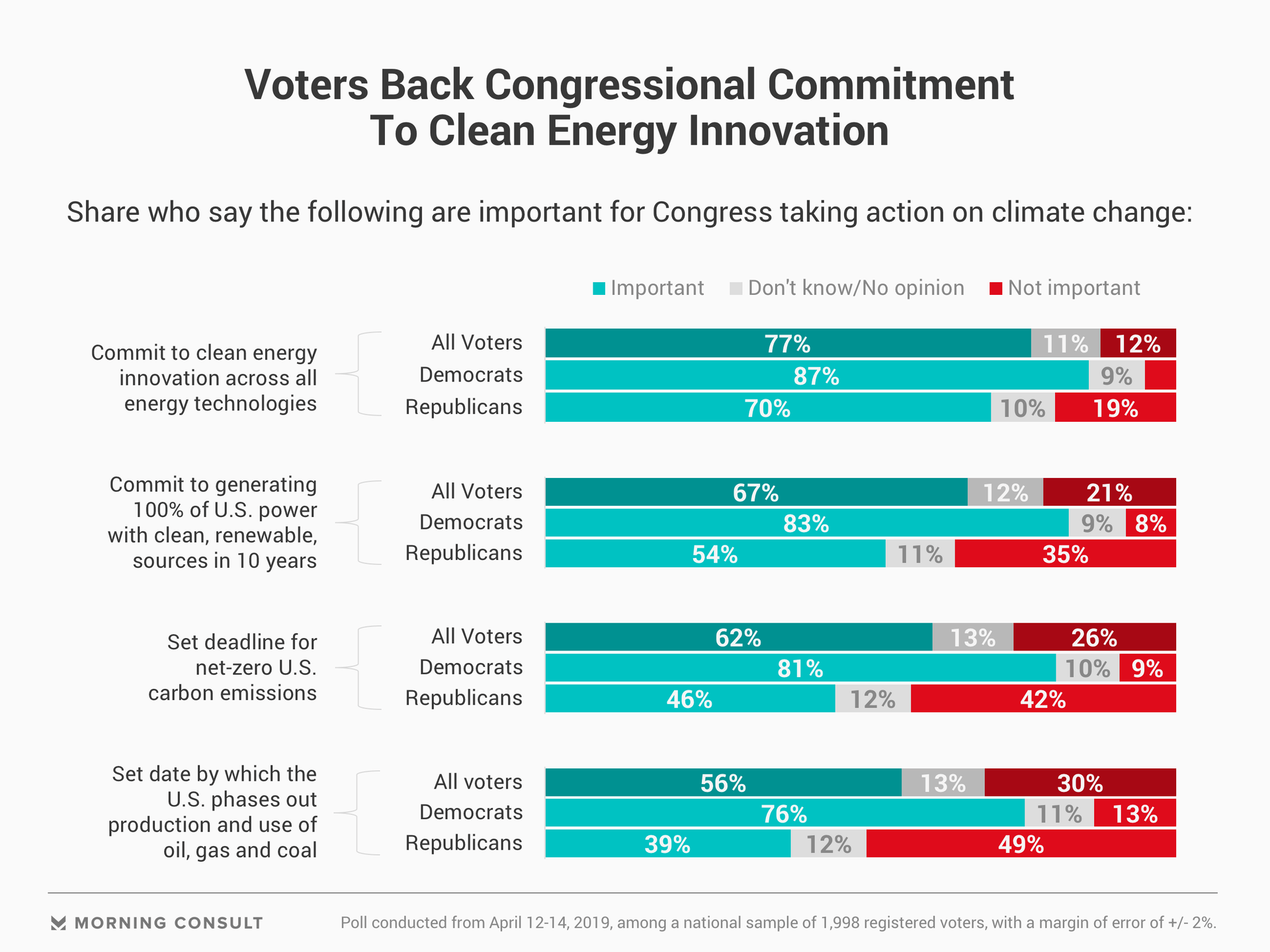 When it comes to addressing climate change, majorities of U.S. voters consider it important for Congress to commit to clean energy innovation and 100 percent clean power generation over 10 years, according to new polling from Morning Consult/Politico. And while Democrats and Republicans were more likely to support their own party’s proposals over those offered by the opposition, voters rallied in greater numbers around some of the individual policies put forward in the resolutions.