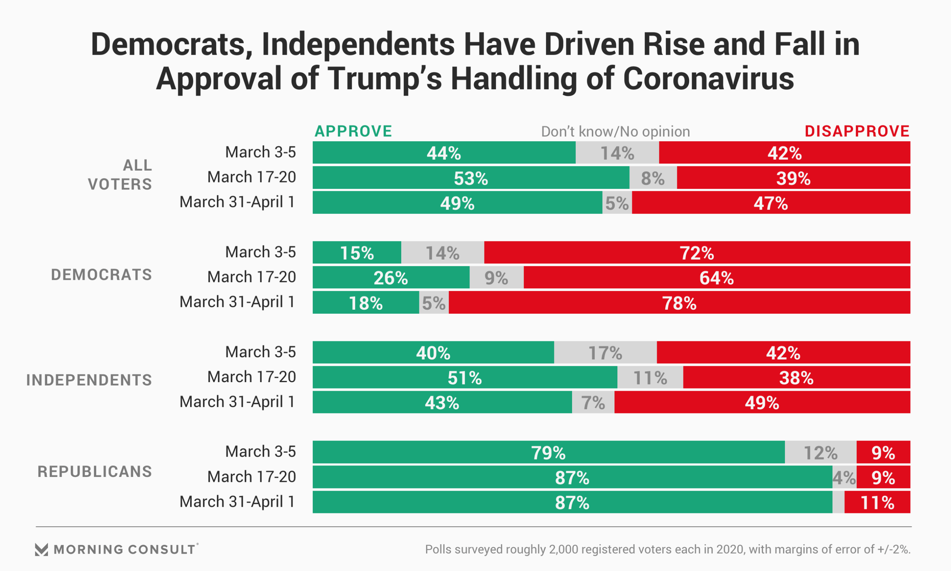 Trump’s gains during the first half of last month came as his administration ramped up its response to the virus, including the introduction of national social-distancing guidelines and enactment of multiple spending relief packages passed by Congress. The uptick, which appeared to demonstrate a “rally around the flag” effect, common during crises, was fueled largely by more positive perceptions among independents and Democratic voters.