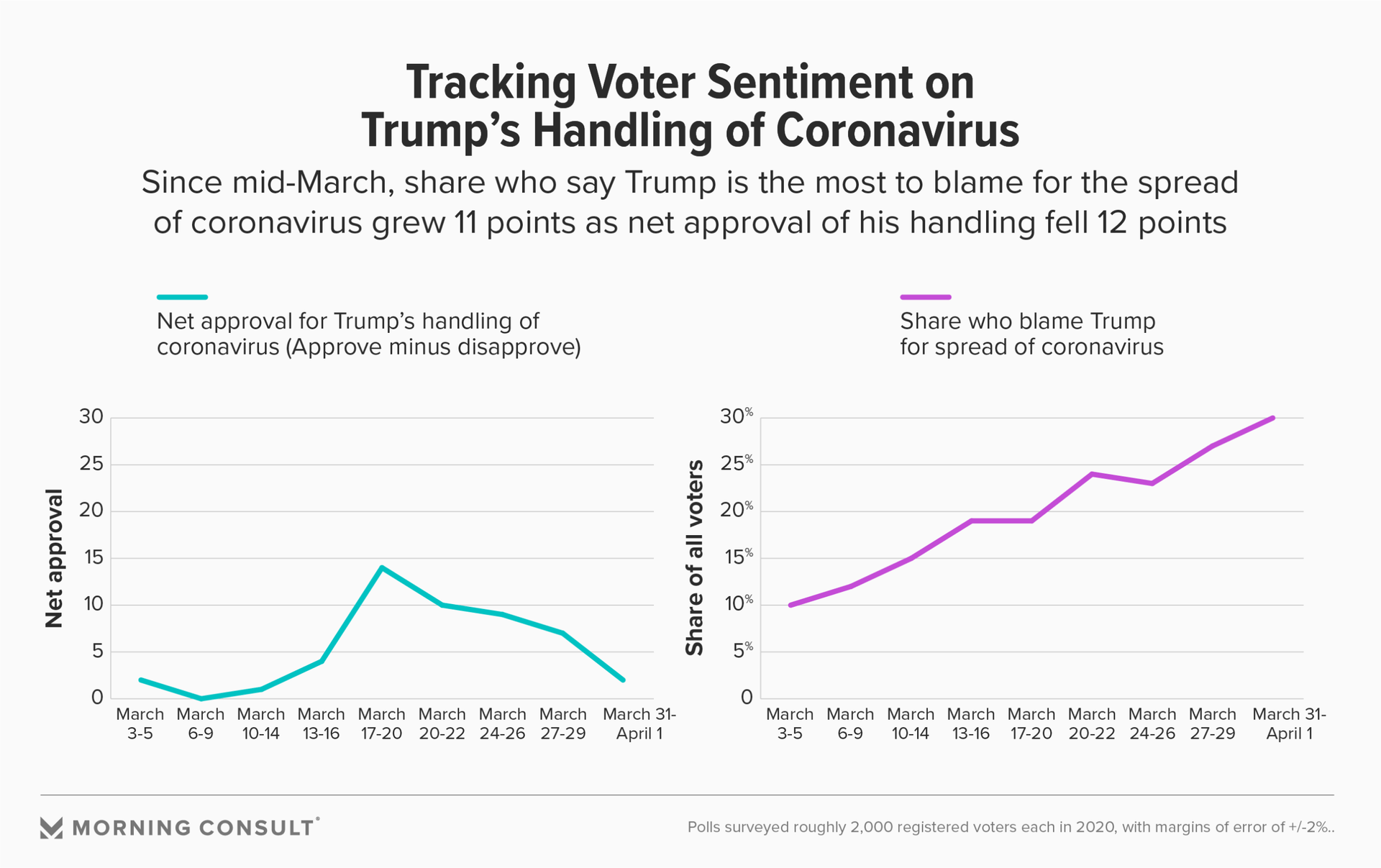 Morning Consult polling conducted in the past few weeks shows that the gains Trump made from early to mid-March have evaporated, with nearly as many voters now blaming him for the pandemic’s spread in the United States as the share who blame the Chinese government.