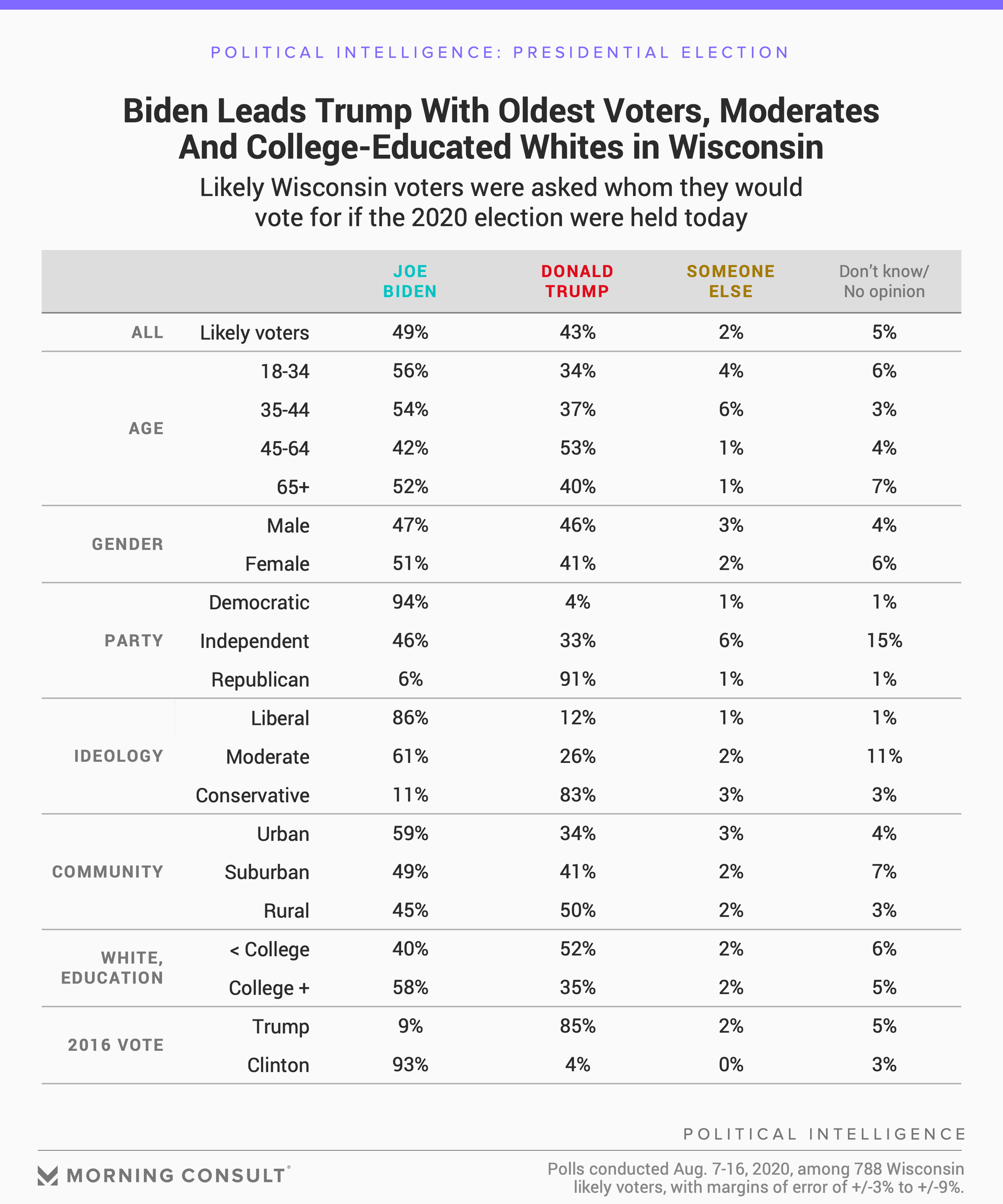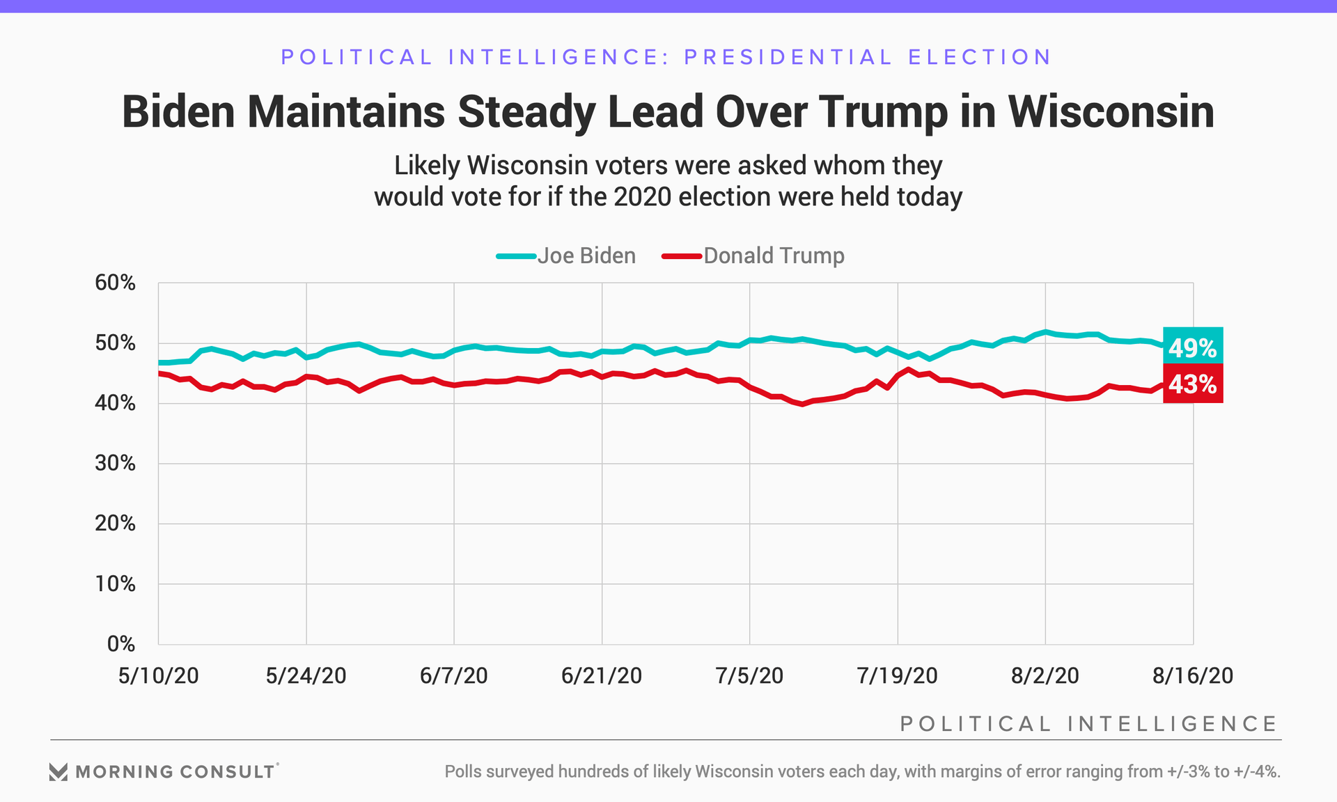 A new Morning Consult poll found Biden leads Trump by 6 percentage points, 49 percent to 43 percent, among likely voters in Wisconsin, while another 7 percent said they would either vote for someone else or are undecided. The poll of 788 Wisconsin likely voters was conducted Aug. 7-16, and has a margin of error of 3 points.