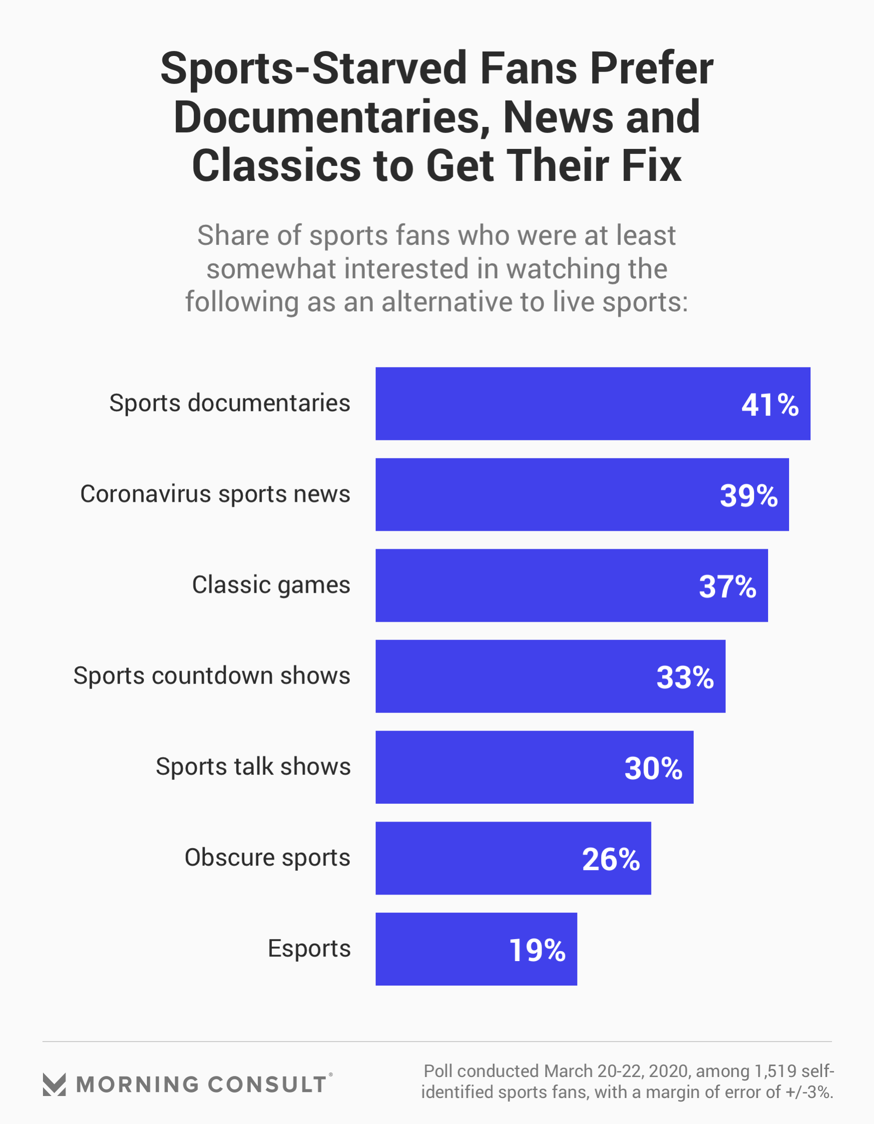A Morning Consult survey conducted March 20-22 shows that self-identified sports fans are most interested in sports documentaries, news programming related to the pandemic’s impact on sports and classic games as alternatives to watching live sports.
