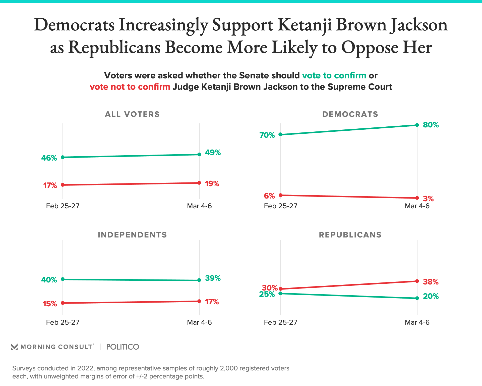 - Democratic voters are about twice as likely to support Jackson’s confirmation as Republican voters are to oppose it even after notable increases on both sides over the past week.