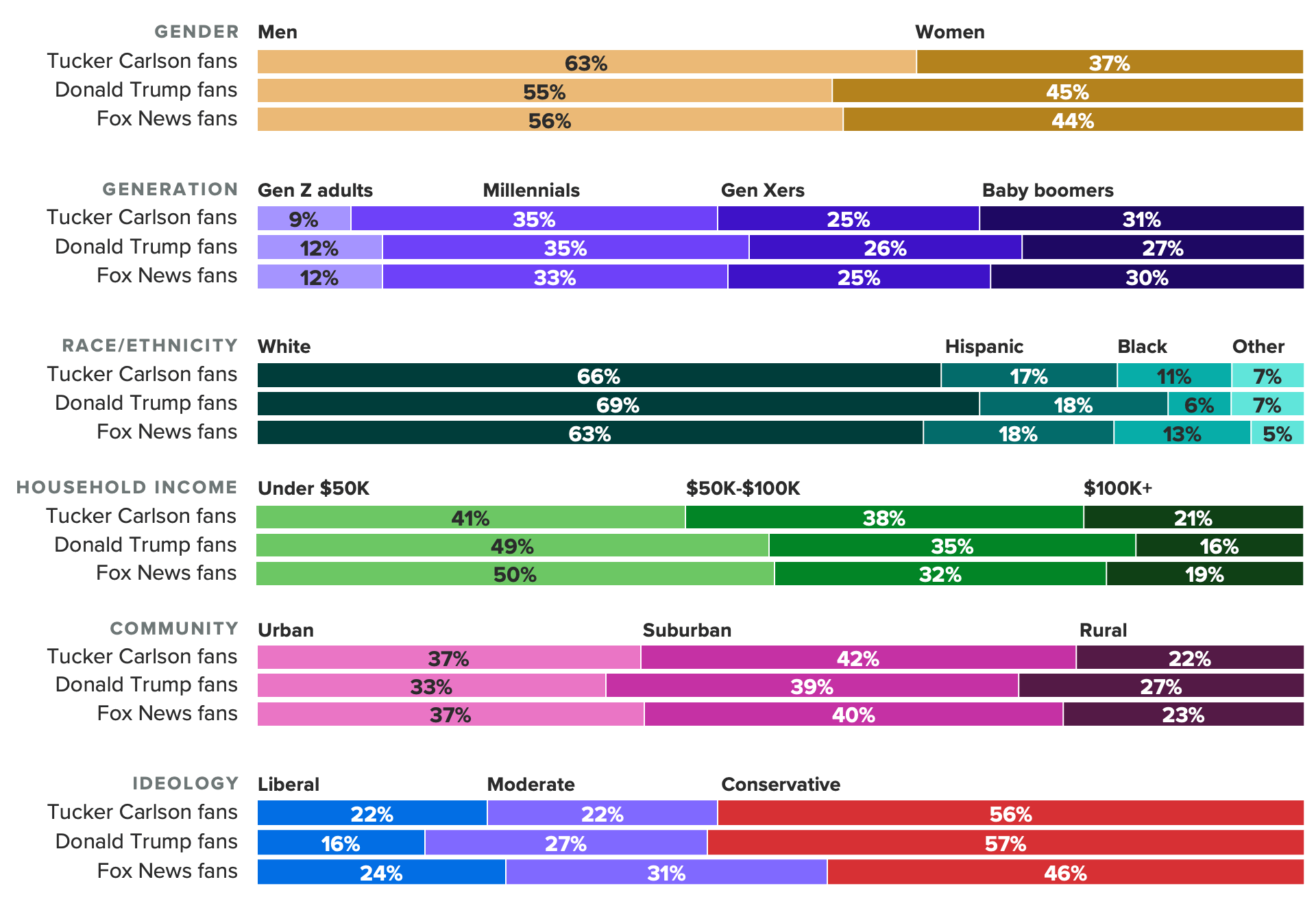 Demographic profiles of U.S. adults who identify as fans of Tucker Carlson, Donald Trump and Fox News