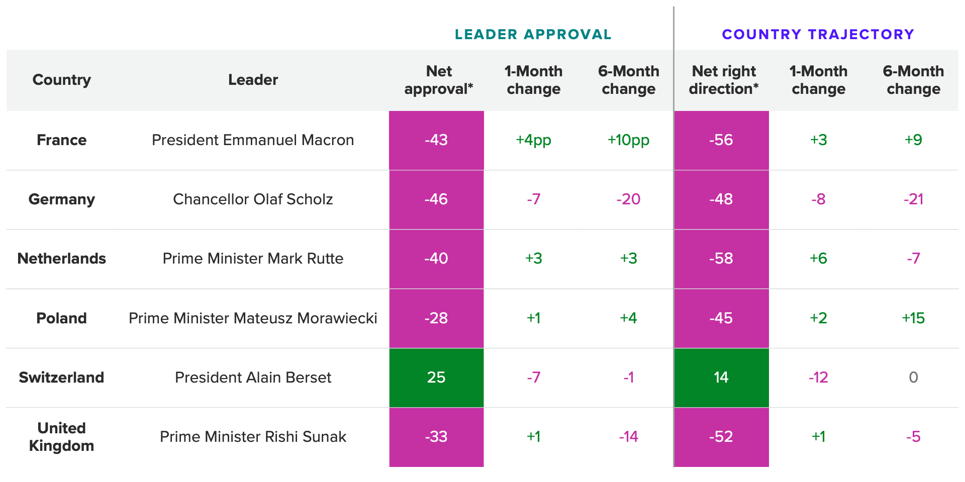 Source: Morning Consult Political Intelligence. Data points for France, Germany, the Netherlands, Poland and the United Kingdom represent 7-day simple moving averages of daily surveys. Data points for Switzerland represent 30-day simple moving averages of daily surveys. One-month change corresponds to Sept. 15-Oct. 15, 2023. Six-month change corresponds to April 15-Oct. 15, 2023.