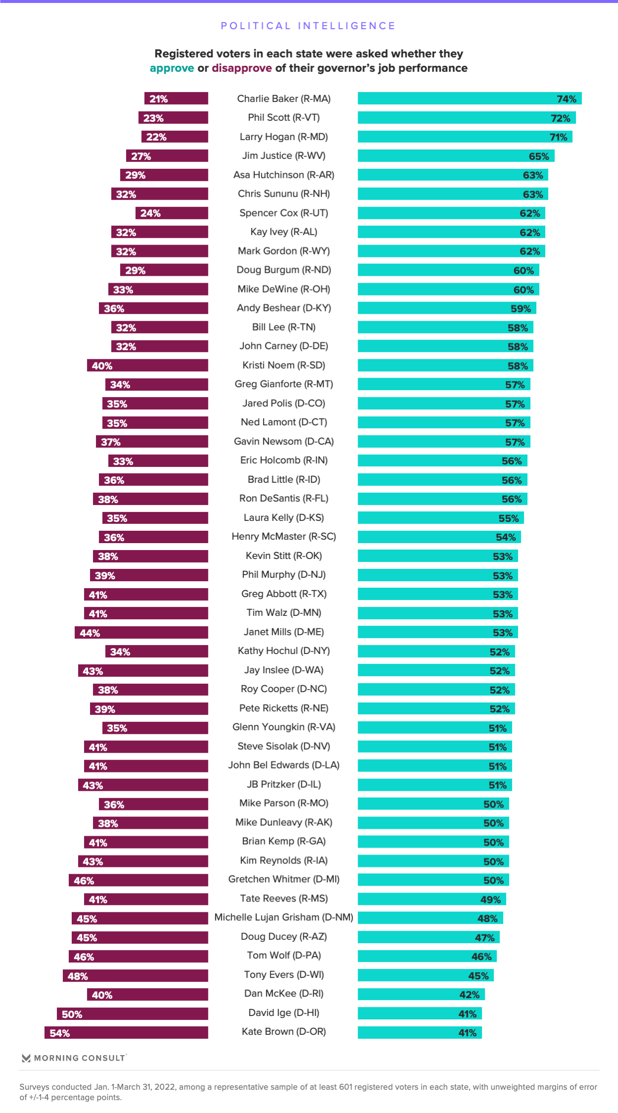 - With approval ratings above 70%, Republican Govs. Charlie Baker of Massachusetts, Phil Scott of Vermont and Larry Hogan of Maryland are America’s most popular governors. Scott, who is the only member of that trio who may seek re-election this year, has seen his approval rating fall from 84% in the first quarter of 2021 to 72% in the first quarter of 2022.