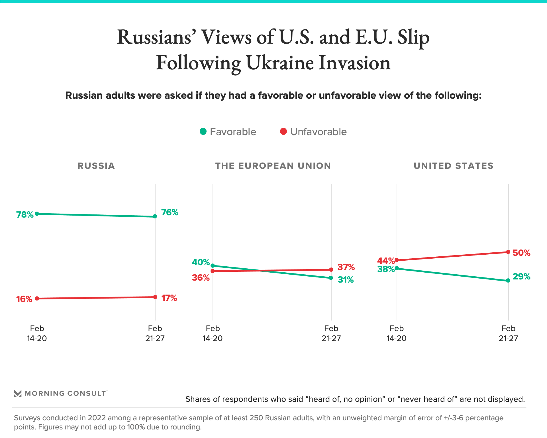 The latest Morning Consult surveys were conducted Feb. 14-20, 2022, and Feb. 21-27, 2022, among at least 250 adults in each country, with unweighted margins of error of plus or minus 1 to 6 percentage points.