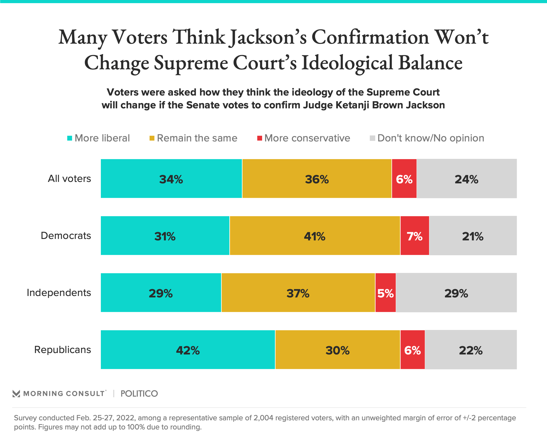 - About a third of voters (34 percent) said Jackson’s confirmation would make the Supreme Court at least somewhat more liberal, just shy of the 36 percent who said her ascension would not change the court’s ideological balance at all.