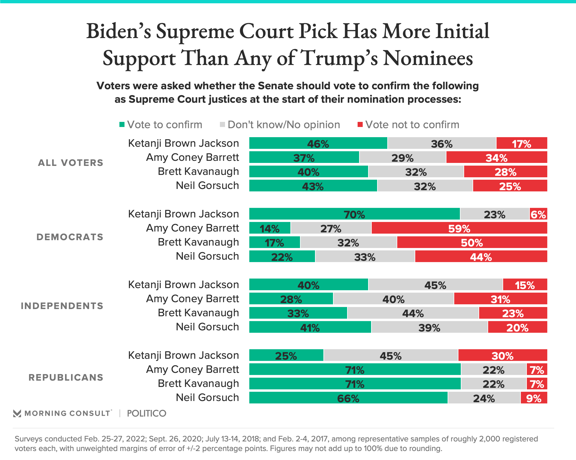 Judge Ketanji Brown Jackson, President Joe Biden’s Supreme Court pick, has more initial support for her confirmation than any of the three jurists nominated by then-President Donald Trump, according to a new Morning Consult/Politico survey.