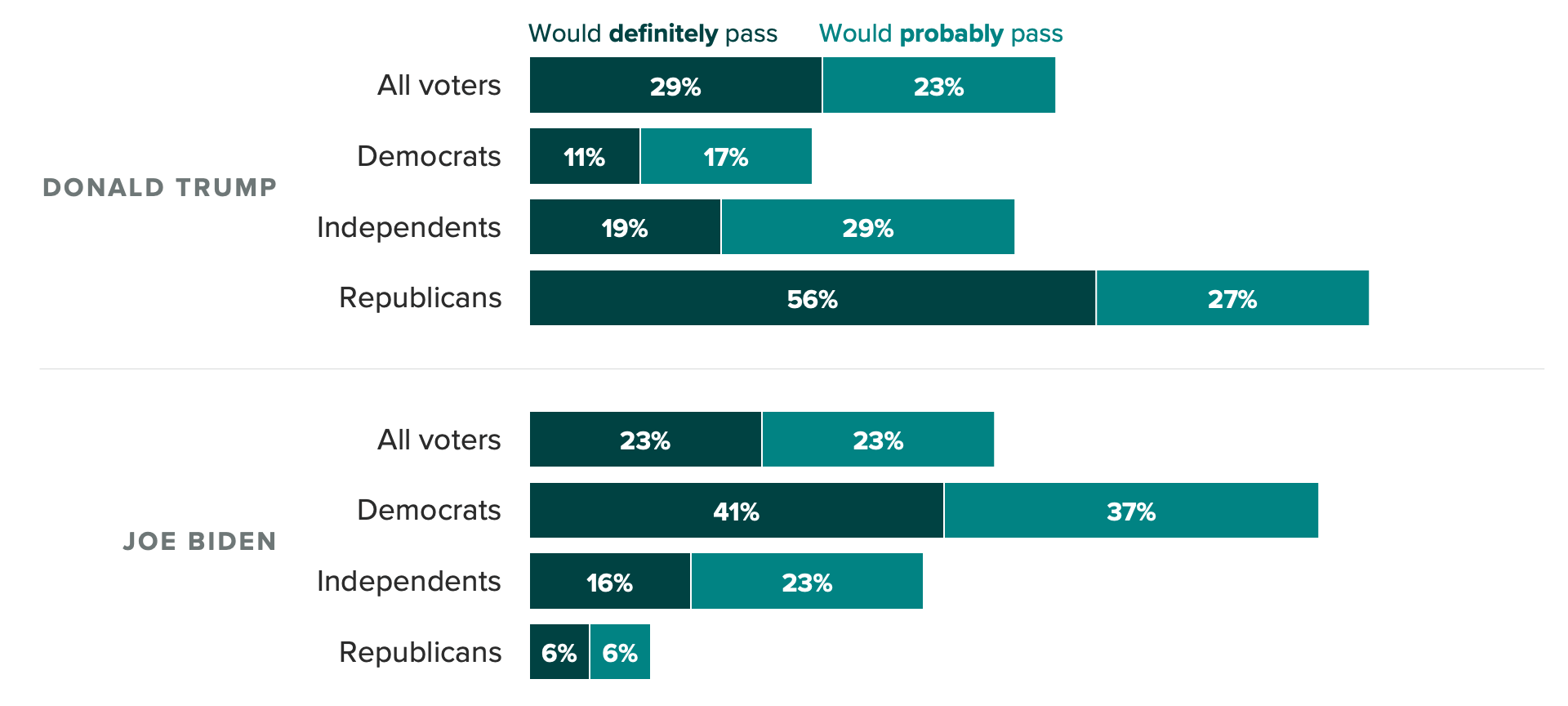 - Republican voters (56%) are more likely to say Trump would “definitely pass” a mental competency test than Democrats are regarding Biden (41%).