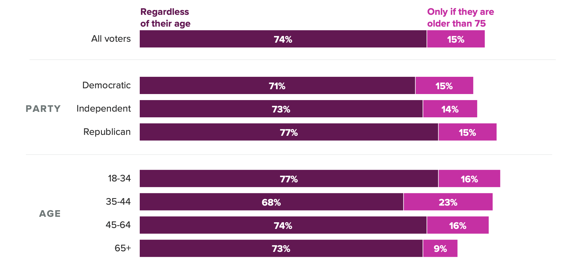 - Three in 4 voters (74%), including 71% of Democrats and 77% of Republicans, said presidential candidates of any age should have to pass a mental competency test. Less than a fifth of Democratic and GOP voters (15%) said the gauge of cognitive fitness should only apply to those older than 75.