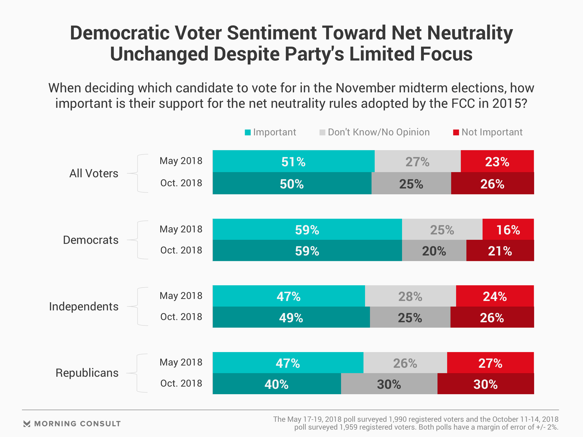 The survey, conducted Oct. 11-14 among a national sample of 1,959 registered voters, found 59 percent of self-identified Democratic voters considered support for net neutrality to be a somewhat or very important factor when deciding which candidate to support during the midterm elections -- a figure that was unchanged from polling conducted May 17-19. Among all voters in the latest survey, 50 percent said the issue would be an important consideration when choosing a candidate.