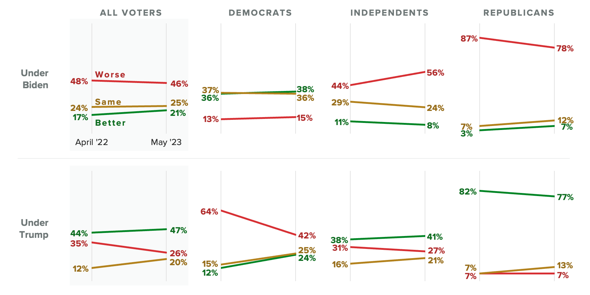 - Voters are about as likely to say the immigration system has worsened under Biden as they are to say it improved under Trump (46% to 47%) when asked to compare the two to their predecessors.