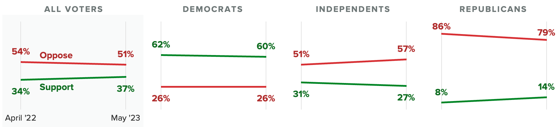 - Independent voters are now 6 percentage points more likely to oppose Biden’s lifting of the border controls than they were last year (57% to 51%), while just over a quarter (27%) back the move, 4 points lower than in 2022.