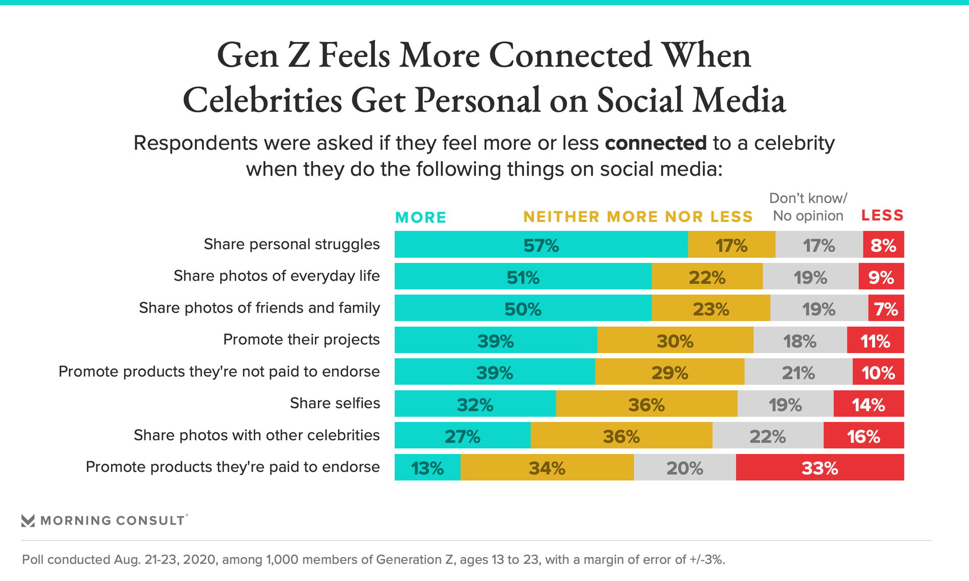 A Morning Consult survey of 1,000 Gen Zers, which includes those ages 13-23, found that two-thirds said celebrities should use social media platforms to connect and interact with fans, while just over half (53 percent) said they feel more connected with celebrities who share details about their lives on social media.