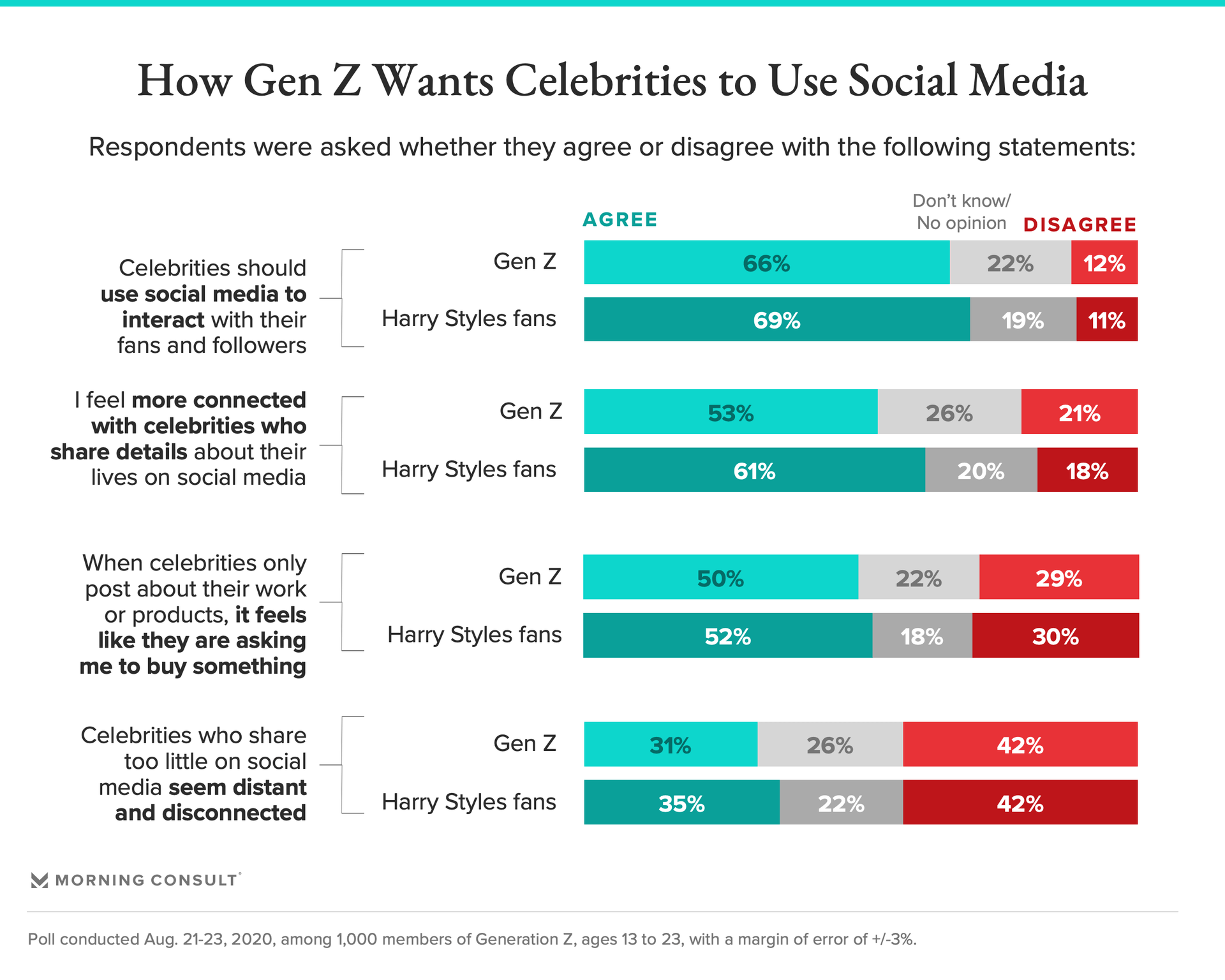 Additionally, 31 percent of Gen Z and 35 percent of Styles fans said stars who share too little on social platforms seem distant and disconnected, but 42 percent of Gen Z overall disagreed, as did an equal share of Styles fans.