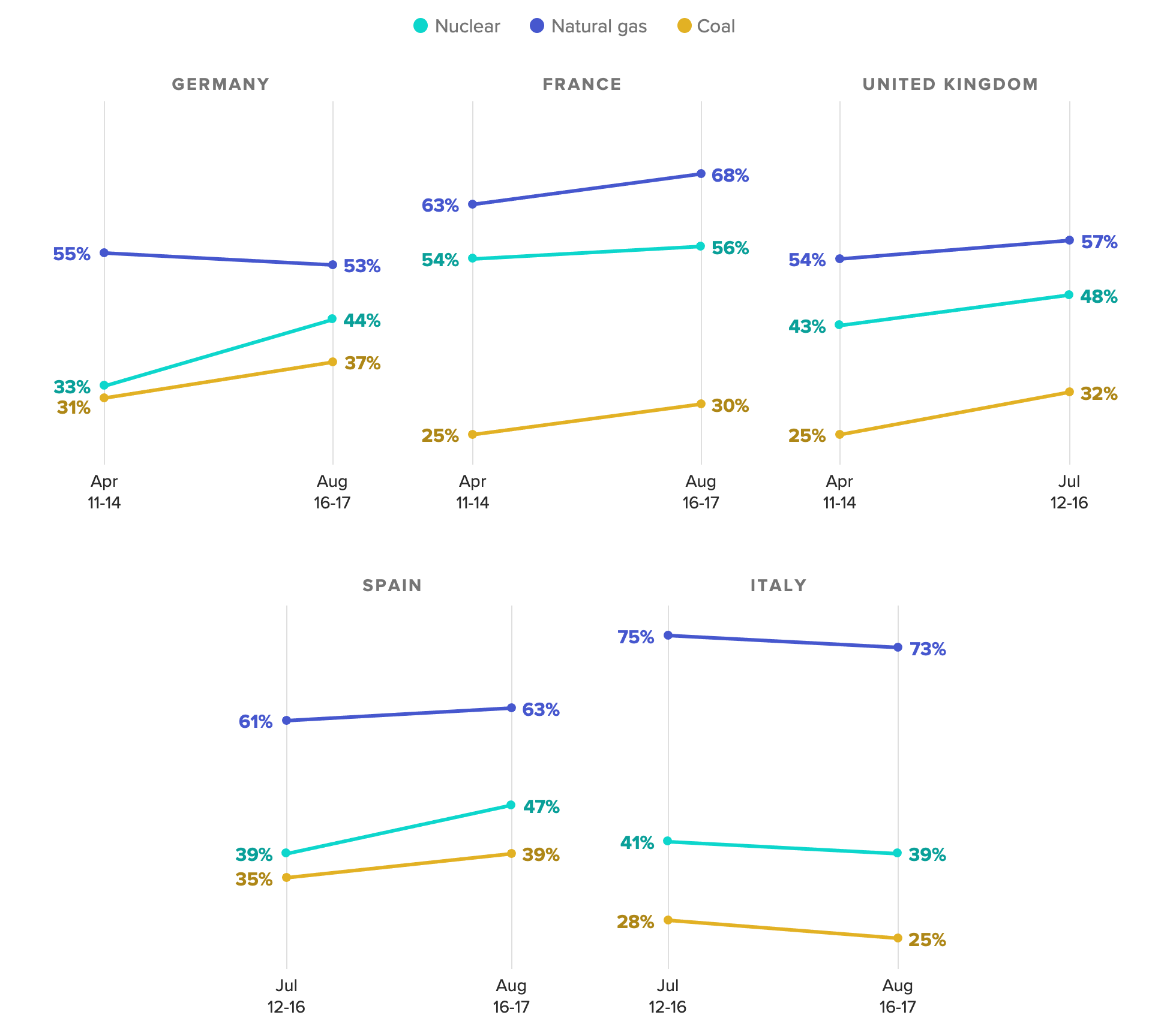 Natural gas remains the preferred nonrenewable energy source in Europe’s five largest economies, and its popularity actually improved in France, the United Kingdom and Spain even as prices have risen this summer. In Germany and Italy, favorable views only fell 2 points.