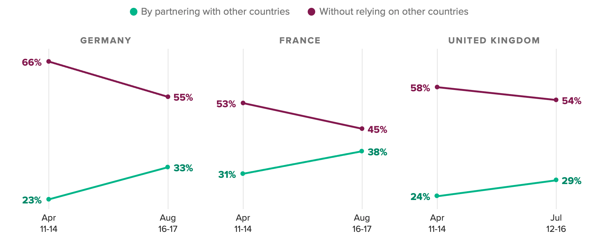 According to Morning Consult surveys, the share of Germans who believe they would be better off partnering with other countries for energy security rose 10 percentage points, to 33%, between April and August, while France saw a 7-point increase, to 38%, over the same period. In the United Kingdom, meanwhile, there was a 5-point increase, to 29%, between April and July.