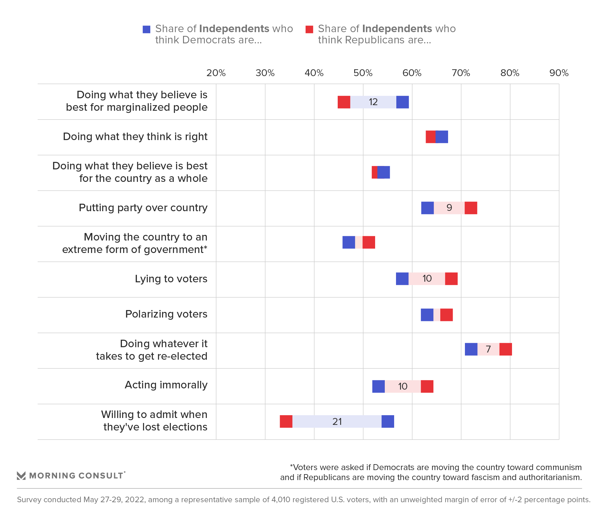 Independents generally view Republicans as worse actors in the country’s political system than Democrats.