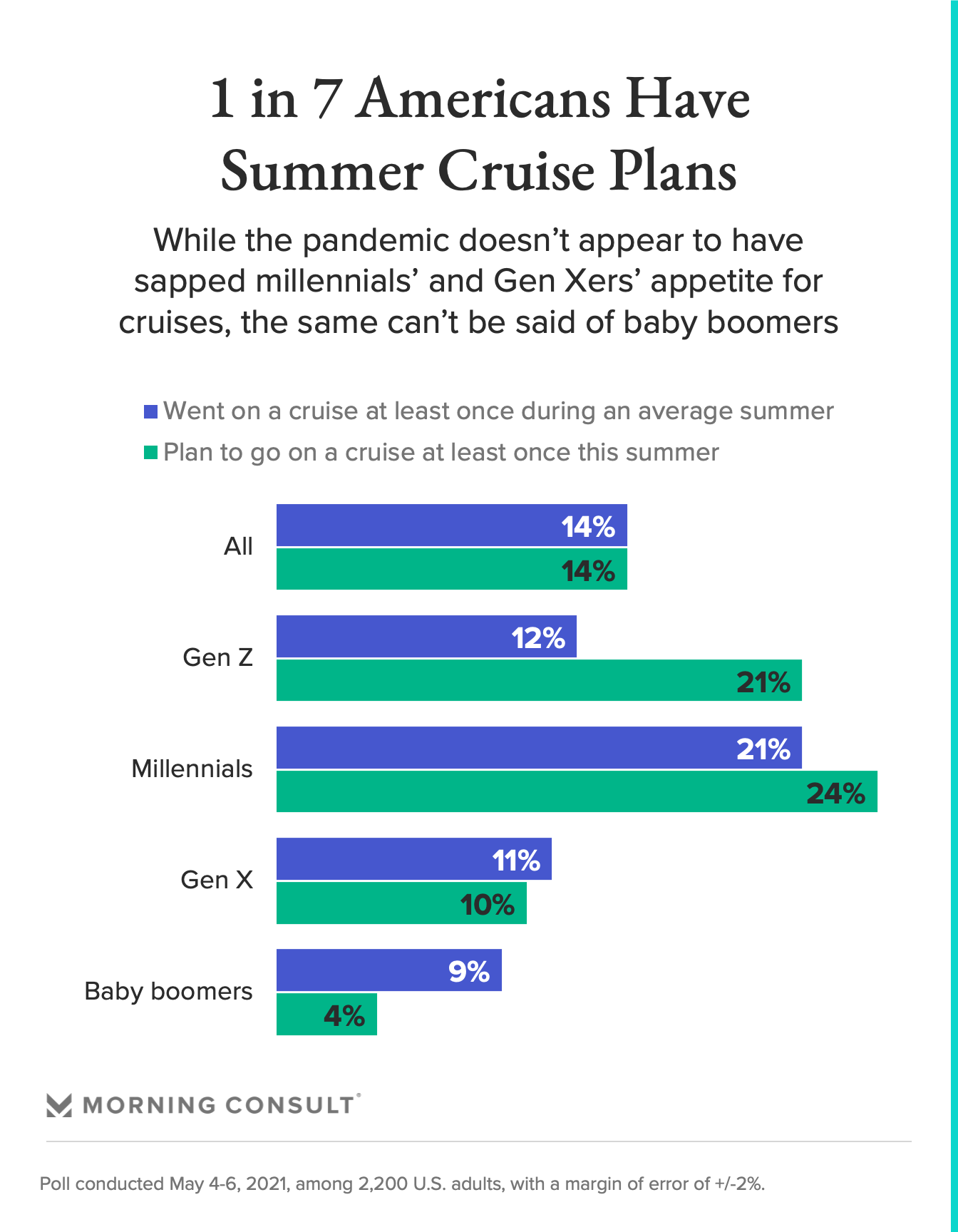 While cruises have typically been associated with an older crowd, the survey found that millennials were the most reliable generational demographic: 21 percent of millennials said they took cruises during pre-pandemic summers and slightly more (24 percent) plan to do so this summer, both more than any other generation.