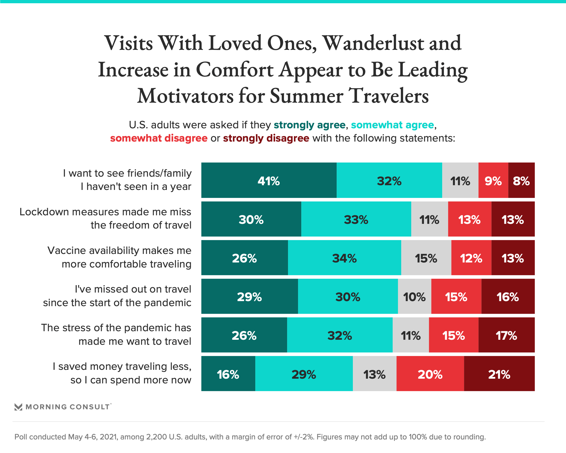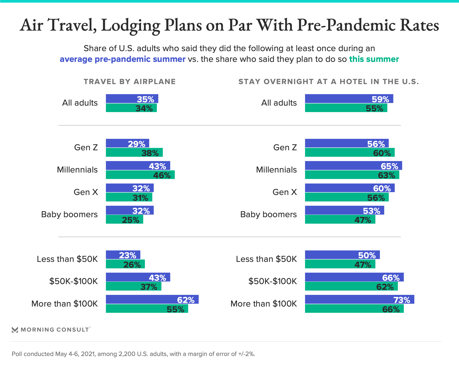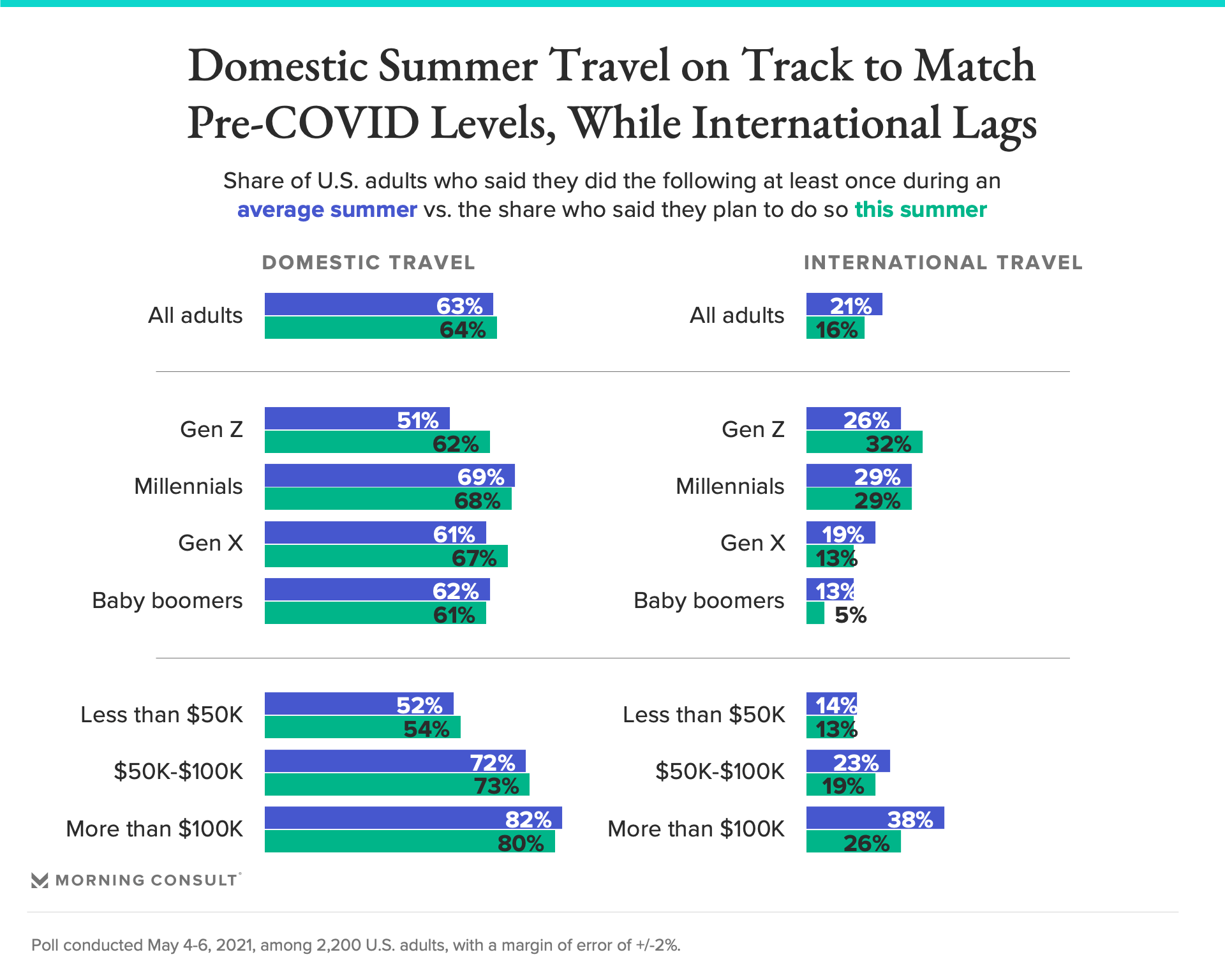 Sixty-four percent of U.S. adults said they’re planning to travel within the country at least once between June and September, according to new Morning Consult polling, similar to the 63 percent who said they usually did so before the pandemic.