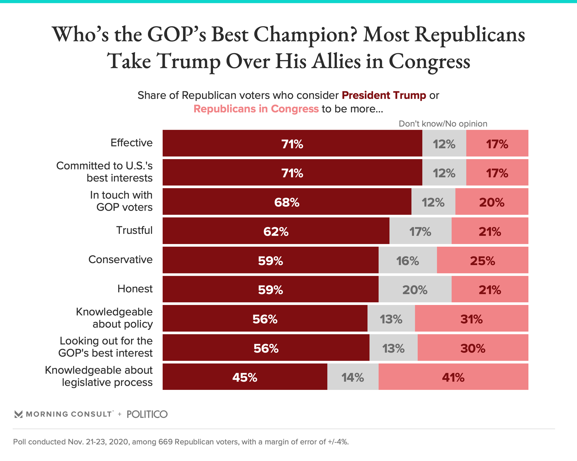 A new survey shows most Republican voters choose the outgoing president over Republicans in Congress when asked who better embodies a number of key party leadership traits, and Trump is the heavy favorite to be the GOP’s next presidential nominee, according to an early, hypothetical test of 14 potential candidates.