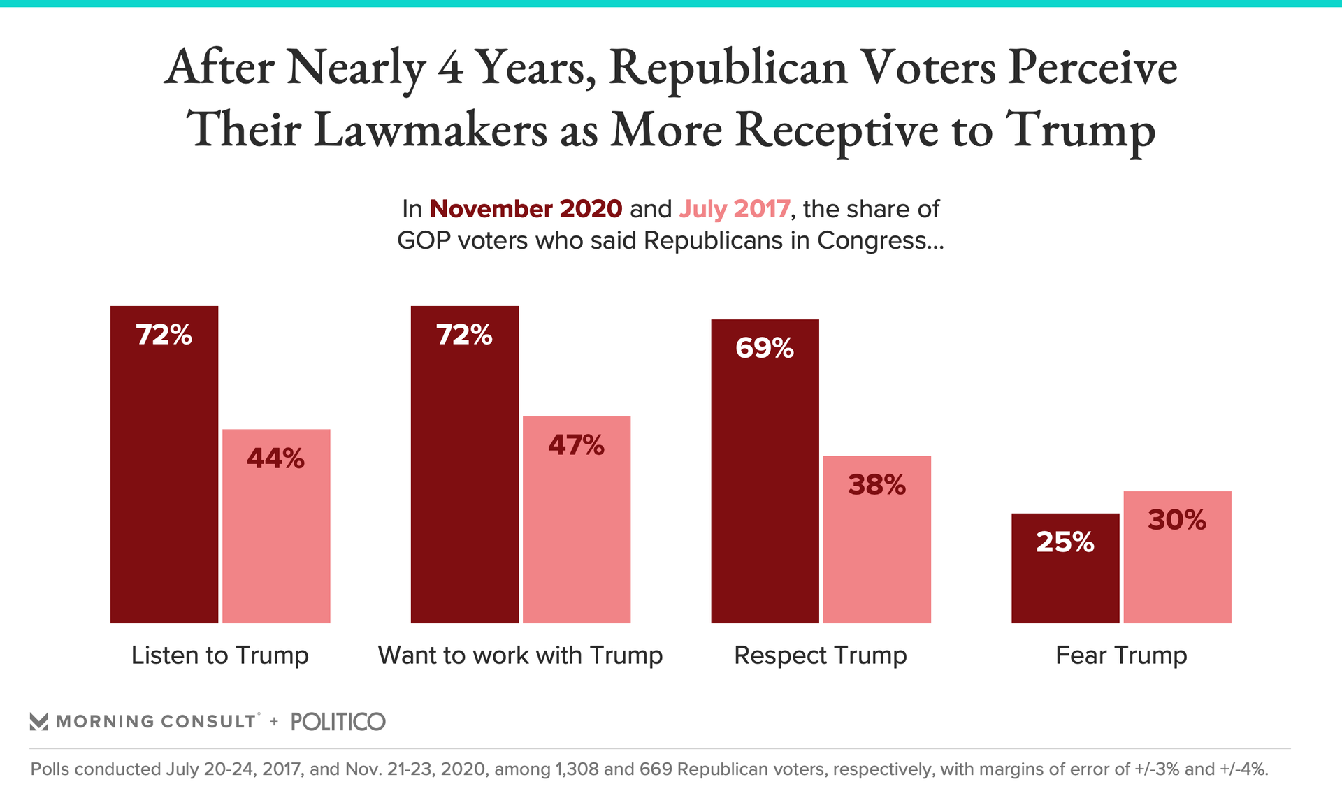 President Donald Trump will lose the official powers of the presidency in less than two months when Joe Biden takes office, a time when most recent presidents have stepped out of the spotlight to let their successors get their bearings. But with no indication that Trump is likely to fade into the background after he leaves the White House, Morning Consult/Politico polling suggests he’ll retain enormous influence over the Republican Party from outside the government.