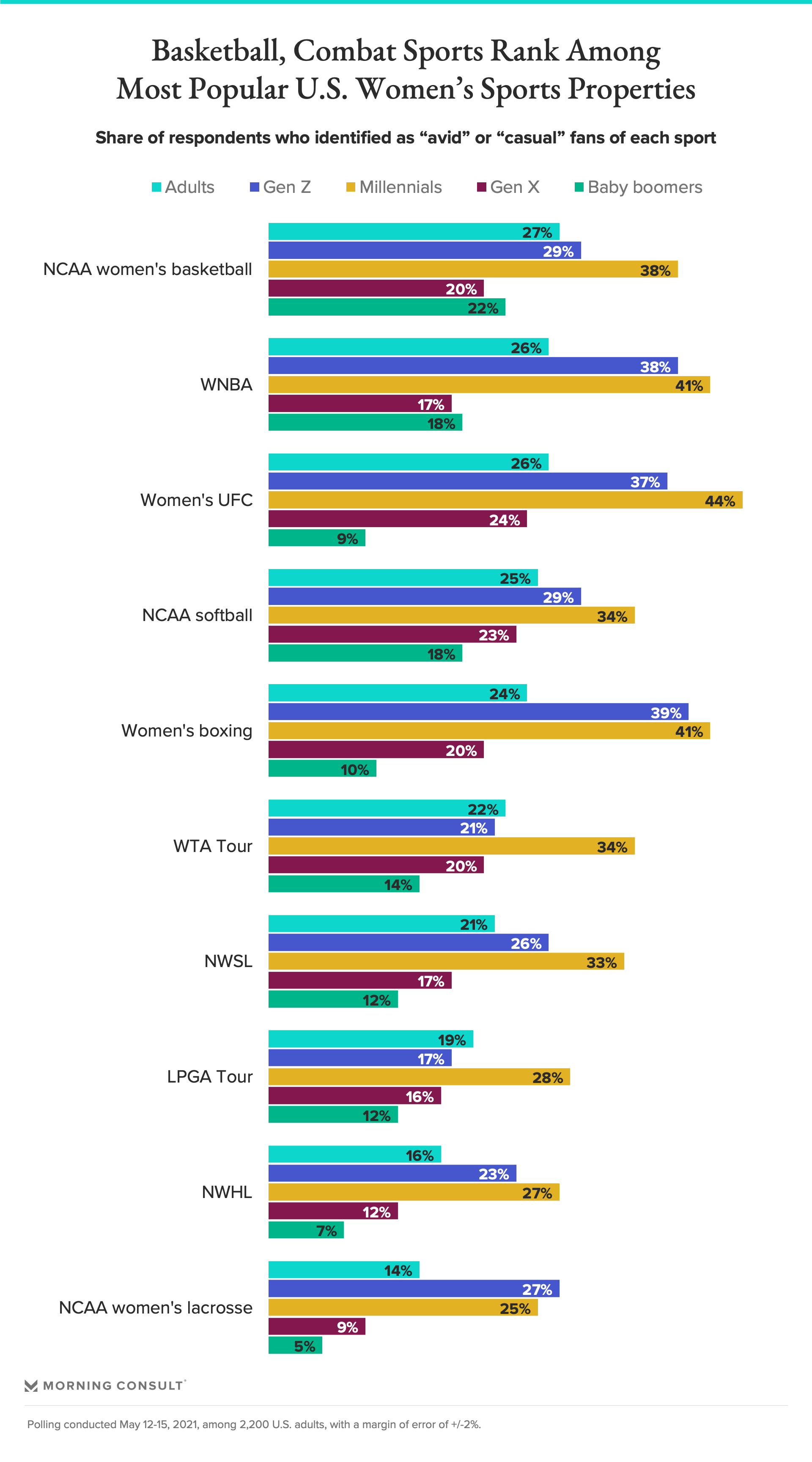 The results of the survey also indicate that millennials are more likely than other generations to identify as fans of women’s sports properties, as are members of Generation Z to a lesser extent. (Gen Zers are generally less likely to identify as sports fans than their elders.) NCAA women’s basketball, the WNBA, women’s UFC, NCAA softball and women’s boxing were the most popular women’s sports, with about 1 in 4 U.S. adults identifying as either an avid or causal fan.